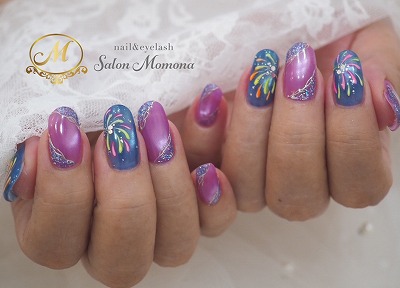 ◆マグネットネイルをベースに、手描きで花火をのせた夏ネイル。