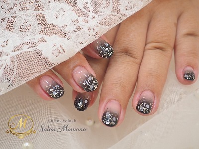 黒のグラデーションにホロラメをミックスしたデザインは、大人っぽくもキラキラ華やかさをプラス。夜のイベントにもぴったりです。