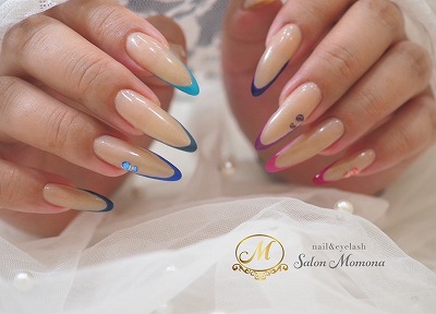 細めのフレンチラインを使った繊細なデザインで、カラフルな色使いが夏の気分を盛り上げます。個性的だけど上品さも兼ね備えた仕上がりが魅力です。
